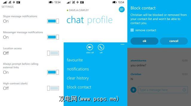 最大的好处是您可以阻止他人。为此,请在“人物"视图中点击相关联系人以打开消息窗口,打开菜单并选择阻止联系人。虽然将要求您进行确认,但是请注意,没有选择向Skype报告作为令人反感或垃圾邮件的联系人的消息。