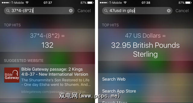 在搜索栏中,您还可以执行许多其他操作。 Spotlight可以求解数学方程式并转换货币,例如: