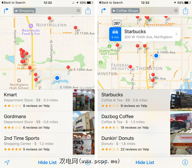 Apple通过iOS 9中的Maps应用程序确实提高了他们的游戏水平,并且将其集成到Spotlight建议中是此版本操作系统中很酷的新功能之一。当您打开Spotlight屏幕时,会在附近部分中选择四个不同的类别。点击其中一个,您将被带到“地图"应用,并显示该类别的附近选项。