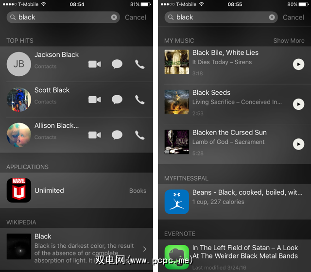 下面是Myfitnesspal中关于黑豆的食物日志中的一个条目。之后,在我的Evernote应用程序中有一个笔记,叫做“在撒旦的左视野-怪异的黑色金属带"。然后,在我的Google云端硬盘应用程序中存储的文件名中包含包含“黑色"的图像。以及IMDB应用中标题中带有“黑色"的电影。然后从上面列出的联系人中,在我的消息应用程序中获得许多消息。