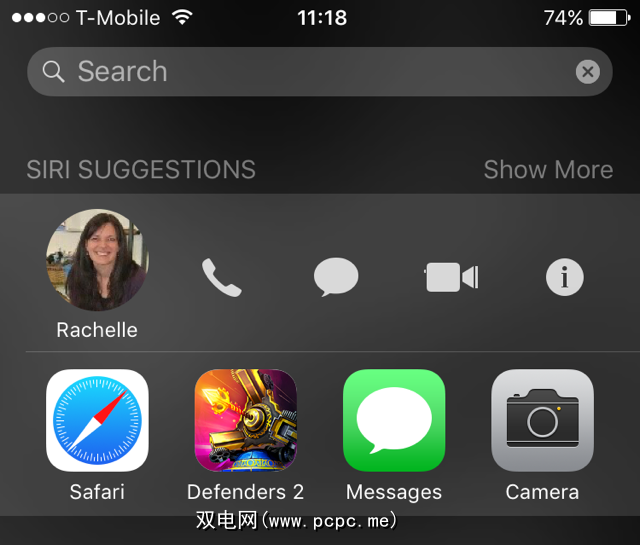 向右轻扫以打开Spotlight,您会看到一个名为 Siri建议的部分,其中包含四个联系人和四个应用程序的列表。如果要呼叫,发短信或Facetime这些联系人之一,只需点按他们的图片,然后从弹出的图标列表中选择要使用的通信方式即可。