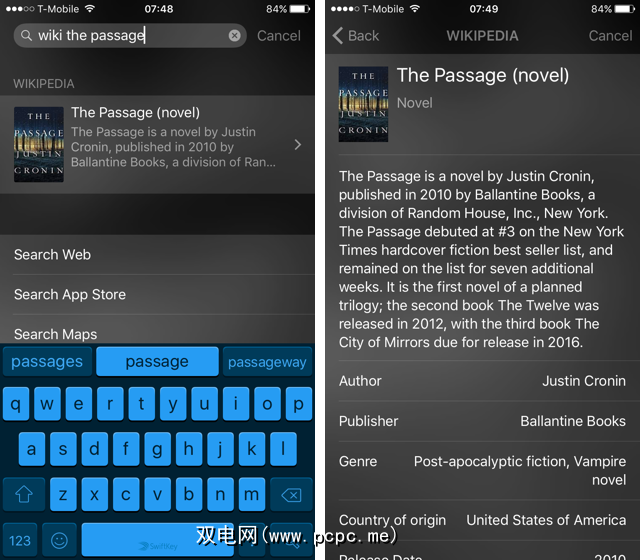 如果您输入“ wiki"和一个搜索词,您无需打开Safari即可直接从Wikipedia上找到所需内容的页面: