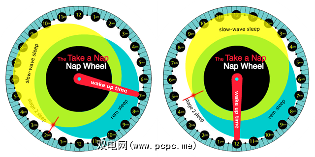 寻找“ REM睡眠"和“慢波睡眠"圆圈相交的位置,如上图所示。到那时,您才能获得最佳的午睡时间。她的《 打个T!改变生活。