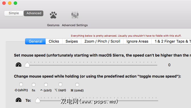 不仅有更多功能,用于设置系统级光标速度的精确滑块,每当您按住修改键时,它也可以更改光标速度。可能的修饰符包括Shift,Function,Control,Option,Command或它们的任意组合。