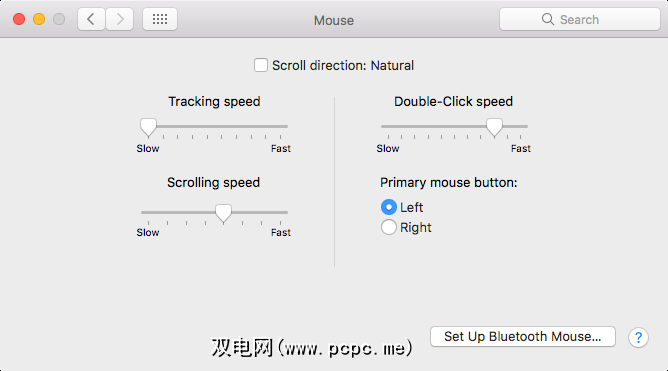 Once the mouse is connected, navigate to System Preferences > Mouse to configure it. There aren’t many settings to change here, but it’s enough for the most basic of tweaks. (You’ll also notice a Set Up Bluetooth Mouse… button, which provides another way to pair new mice.)
