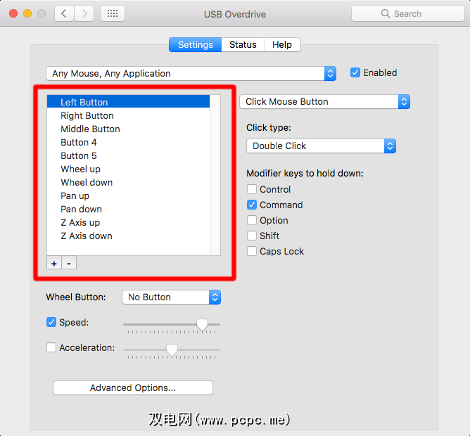 此部分列出了<决定何时注册操作的strong>修饰符。例如,将点击类型更改为“双击"并启用“命令"修饰符将使其生效,以便仅在按住Command的情况下双击时才触发“左键"动作。可以根据自己的意愿随意定制这些内容。
