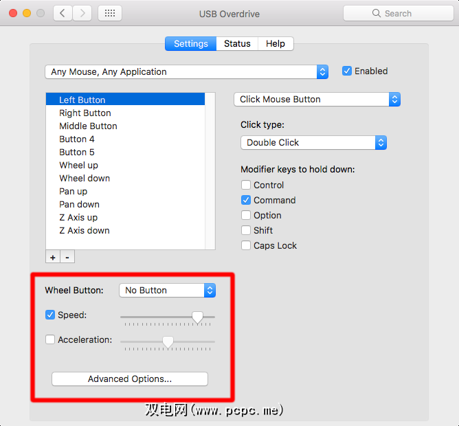 与以上分开。 车轮按钮确定单击鼠标滚轮时哪个鼠标按钮起作用。 速度是一种用于调整光标速度的更精细的方法。 Acceleration (加速度)更改加速度比率(猛击鼠标,光标移动的距离越远)。
