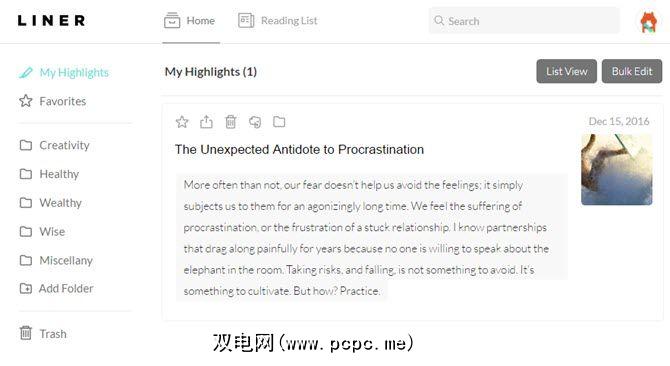 Liner不仅突出显示。它可以帮助您构建突出显示和注释的集合,您可以将其视为书签。您可以创建自己的文件夹并对突出显示进行分类,以方便参考。将特殊的标记为收藏。将它们导出到Evernote上的笔记本中。或通过Twitter和Facebook分享它们。