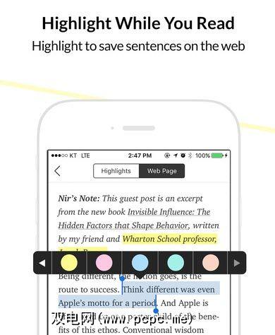 该移动应用程序还允许您从六种选择中选择突出显示的颜色。浏览iOS应用程序以及有关如何设置Liner以与iPhone上的其他阅读应用程序一起使用的即时指南。