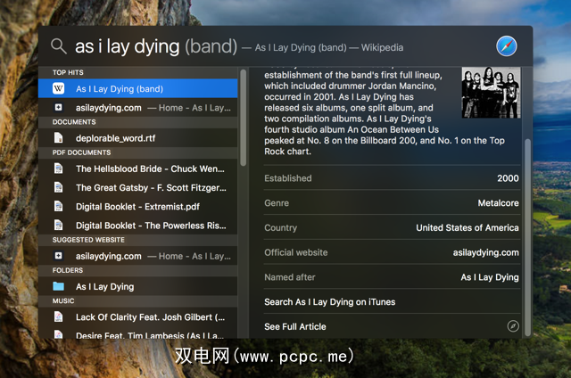 只需启动Spotlight(我们建议您使用键盘,使用 cmd +空格键),然后输入搜索查询。如果结果列表顶部附近未显示Wikipedia结果,则可以使用箭头键或鼠标向下滚动并找到它。 Spotlight首先会优先考虑计算机上文件的匹配,因此,如果您搜索自己喜欢的乐队,它可能会在显示他们的Wikipedia条目之前显示一堆音乐。