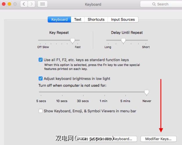 如果您仅想禁用讨厌的修饰键或在它们之间交换功能,请跳过该应用程序。您可以从系统偏好设置>键盘>键盘中执行此操作。在此处,点击修饰键... 按钮。这会弹出一个对话框,您可以在其中将 ctrl 键变成 command 键,或禁用 Caps Lock 键。