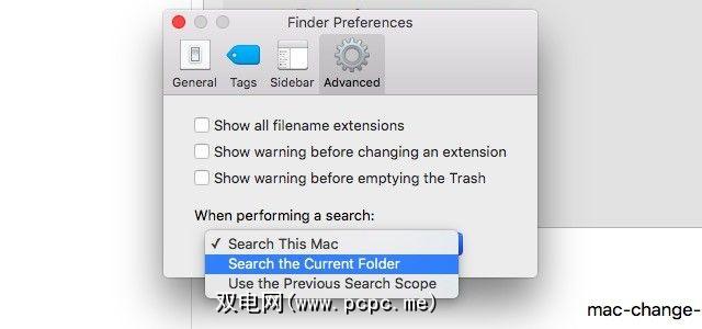 要在Finder中复制Explorer的文件夹内搜索功能,请转到< strong> Finder>首选项>高级,然后从执行搜索的下拉菜单中,选择搜索当前文件夹。
