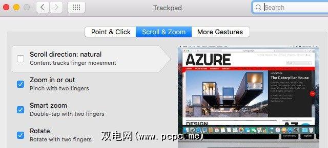 转到系统偏好设置>触控板,并在滚动并缩放标签,取消选中滚动方向:自然旁边的框。这样就可以使Apple和Microsoft计算机上的滚动样式保持一致。