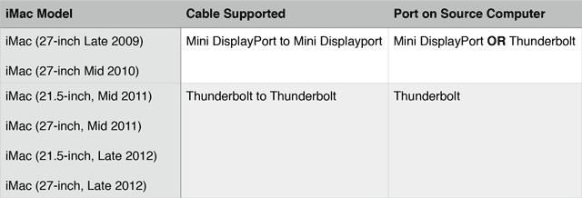 它可以归结为:如果您使用的是旧iMac,如果使用DisplayPort,则只要使用DisplayPort电缆,就可以使用具有DisplayPort或Thunderbolt端口的源设备。但是,以后必须使用Thunderbolt电缆将具有Thunderbolt端口的iMac与Thunderbolt源设备连接。如果这使您的头部旋转,只需在下表中查找iMac即可查看支持的电缆和源设备。在所有情况下,您的iMac均应运行Mac OS X 10.6.1或更高版本。