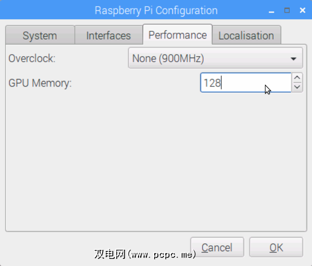 选择 Performance (性能)选项卡选项,您可以应该有两个选择。首先是超频,您可能不需要触摸。但是,请确保将GPU内存设置设置为默认的128 MiB。但是,您可以更改此设置。例如,64MiB非常适合诸如文字处理和电子邮件之类的低强度桌面任务。