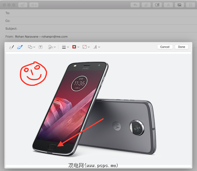 这是Apple帮助页面上提到的一项功能,该功能允许在“邮件"应用程序撰写窗口中快速注释PDF或图像附件。基本上,在附加了这些文件中的任何一个之后,用力按下即可在标记模式下打开它们。使用此模式,您可以素描,添加矩形或箭头之类的形状,覆盖文本,甚至附加数字签名。