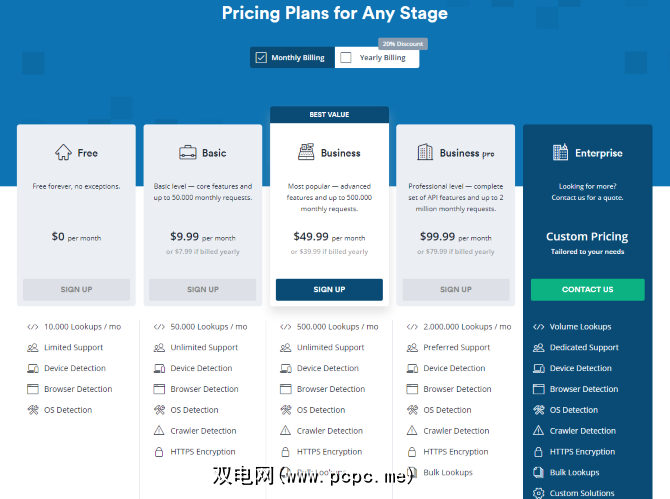 如果每月不需要超过10,000个API请求,那么免费选项非常适合。有了它,您将获得设备,浏览器和操作系统检测以及有限的支持。这是适合小型网站和新手的基本软件包。