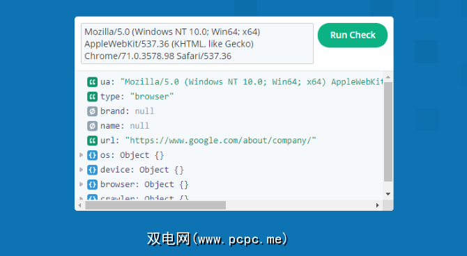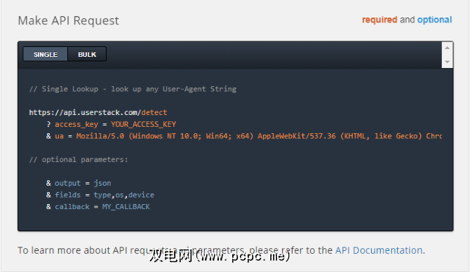 https://api.userstack.com/detect? access_key = YOUR_API_ACCESS_KEY& ua = Mozilla/5.0 (Windows NT 10.0; Win64; x64) AppleWebKit/537.36 (KHTML, like Gecko) Chrome/71.0.3578.98 Safari/537.36检查用户堆栈站点上是否有其他可以使用的API请求,每个请求都有其特定的结果。