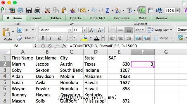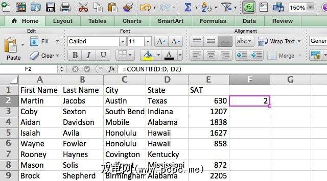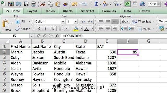 [range]参数定义要计数的单元格范围。在下面的电子表格中,我们有用于姓,名,城市,州和SAT分数的列。有些SAT分数不见了,我们将找出多少。我们知道电子表格中有100个人,因此我们将使用以下语法在SAT分数列上使用COUNT: