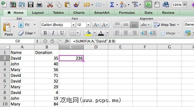 使用直观的说明会更容易。在下面的示例电子表格中,我们有一个名称列表和一个捐赠列表。要添加David收集的所有捐款,我们将使用以下语法: