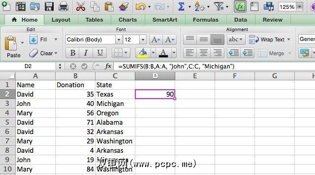 我在捐赠电子表格中添加了一个列,其中包含捐赠的收集状态。使用SUMIFS,我们可以使用以下语法查看约翰在密歇根州的收入:
