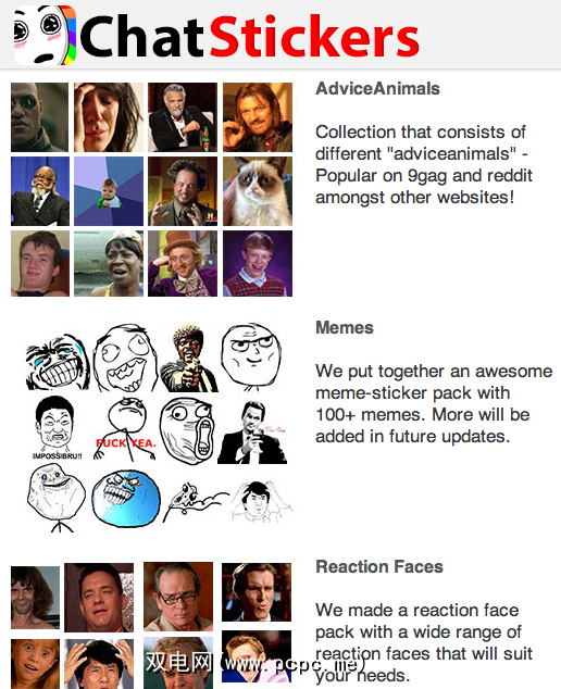 已经有私人站点可以获取更多聊天记录贴纸,是在Facebook的移动发布和网络发布的聊天贴纸之间开发的。 ChatStickers Chrome扩展程序[不再可用]是自定义聊天贴纸的一种。