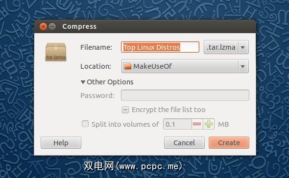 要在任何系统上实现压缩,可以使用适当的命令行工具来实现所需的压缩。但是,Gnome台式机(我也假设使用KDE)具有通过图形方式执行此操作的简便方法。在Gnome中,只需右键单击要压缩的文件或文件夹,右键单击它们,然后选择 Compress 。然后,系统会要求您输入所需的名称,文件类型,保存位置以及选择的压缩结果的密码。