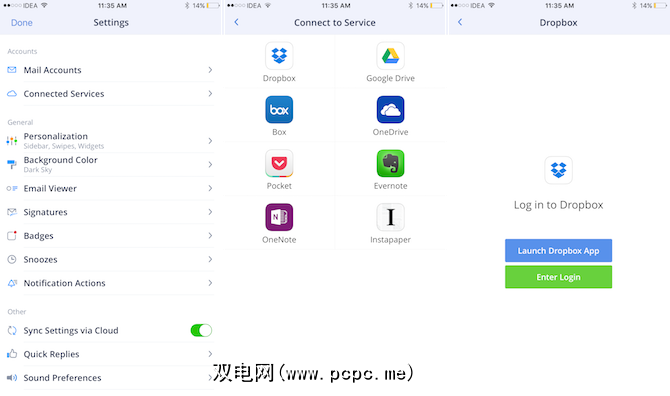 Spark可让您连接Dropbox,Google Drive,Evernote,Pocket等服务。您可以轻松添加存储在Dropbox帐户中的附件。所有这些都无需离开应用程序。