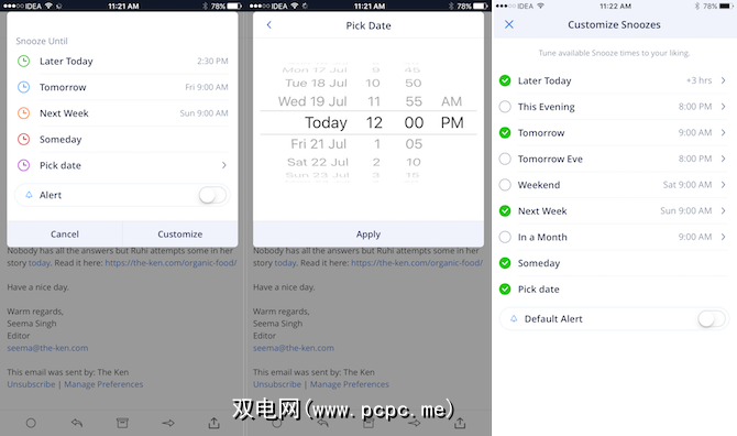 邮箱普及了暂停电子邮件的概念。而且,Spark继承了这一遗产(在许多方面,Spark是Mailbox的精神继任者)。贪睡按钮可让您延迟处理电子邮件。您可以选择今天晚些时候,下周,某天以及选择日期的功能。当您暂停发送电子邮件时,如果时间用完,它将从收件箱中消失并作为未读的电子邮件返回。