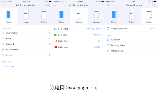 Spark可让您自定义收件箱体验,因此您可以按自己喜欢的方式工作。在“设置"的“个性化设置"部分,您可以找到三个部分:侧边栏,滑动和小部件。