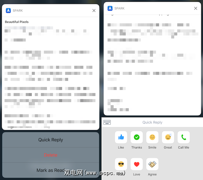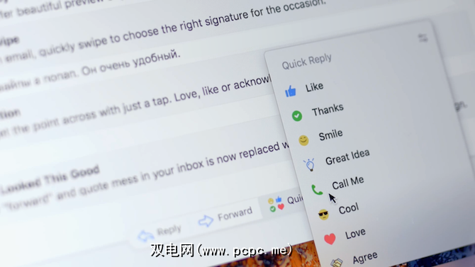 在电子邮件末尾,您会找到“快速答复"部分。您会看到“谢谢",“喜欢",“微笑",“爱"等按钮。您可以点击更多查看所有快速答复。轻按一个后,Spark会自动使用“快速回复"回复电子邮件。
