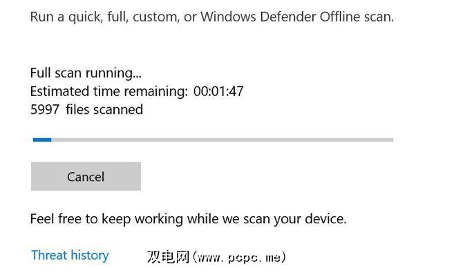 打开开始菜单或点击 Windows键,然后键入 Windows Defender ,然后按Enter。点击病毒和威胁防护图标,然后点击扫描选项。选中完全扫描选项,以完全扫描计算机中的威胁。