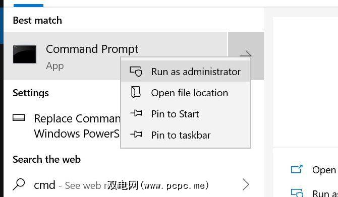 点击 Windows密钥并输入 cmd ,但不要按Enter。而是右键单击命令提示符图标,然后选择以管理员身份运行。 Windows将弹出提示,询问您是否要让应用程序进行更改。单击是。