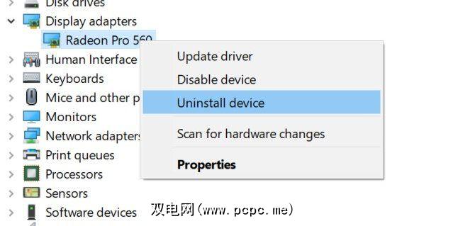 右键单击,或者,如果需要,单击并按住开始按钮并选择< strong>展示广告管理器。展开显示适配器类别,右键单击您的视频卡,然后选择卸载驱动程序。现在,重新启动计算机。