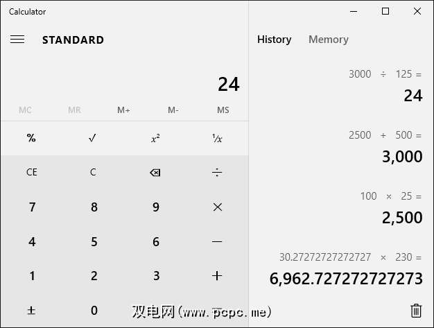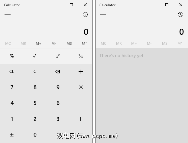 启动“计算器"应用后,您可以通过两种方式查看历史记录。第一种方法很简单:单击右上角的图标或按 Ctrl + H 键盘快捷键。两者都做同样的事情,您可以在上面看到。