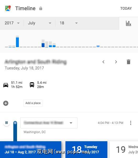 您可以按时间轴上的日期或位置浏览旅程。单击日期将显示您保存的旅程和位置。单击某个位置将使您可以查看上一次访问该位置的时间。