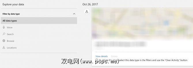 您还可以单击“活动历史记录"标签可查看所有数据类型的完整列表:语音,搜索,浏览历史记录和位置信息。 Microsoft还可以通过单击它来轻松筛选出每个类别。