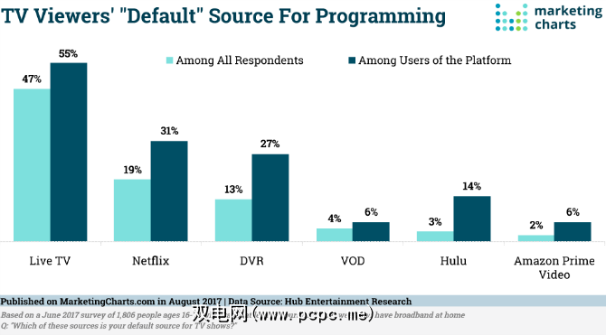 尽管19%的观众可能听不懂令人印象深刻的是,这比2016年高出4%,当时有15%的观众选择Netflix作为默认设置。更重要的是,一旦将DVR,VOD,Hulu和Amazon Prime Video添加到混音中,默认情况下直播电视的功能就会大大削弱。