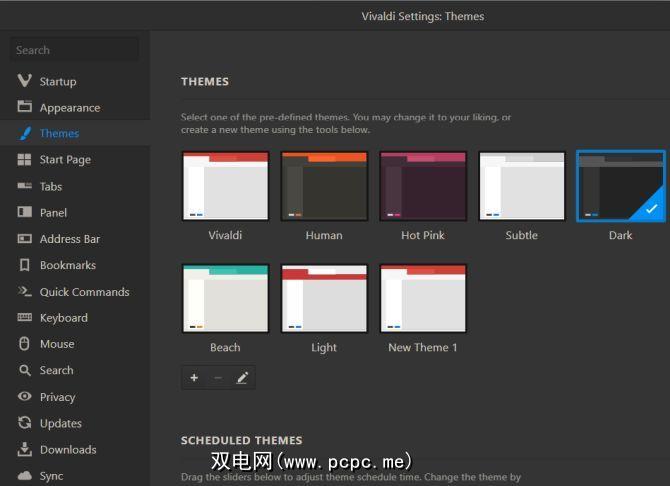 在黑暗的环境中,您想要的最后一件事就是凝视着耀眼的白色屏幕。 Vivaldi允许您通过单击 Settings (设置)图标并单击 Themes (主题),轻松切换到深色主题。