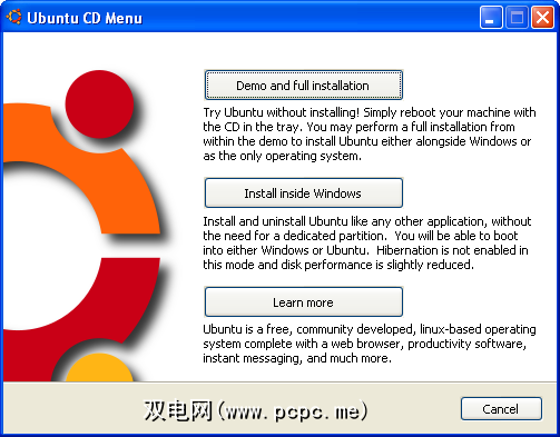 因此,既然您可能已经或可能不了解Wubi的工作原理,我们就可以轻松地进行安装。下周将Ubuntu CD插入Windows机器时,将会看到菜单,其中包含Wubi的选项。