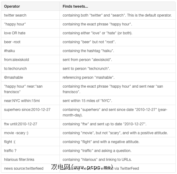 这些仅仅是想法;有趣的是在玩它,看看您能想到什么用途。对您获得的搜索结果不满意?您可以使用Twitter的许多运营商来微调搜索范围。以下是Twitter的屏幕截图,概述了它们的含义: