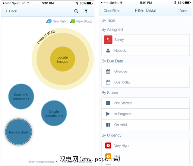 DropTask中Visual View的一个方便功能是可以过滤任务。使用诸如受让人,截止日期,状态,重要性等选项,您可以快速定位任何项目中的特定任务。