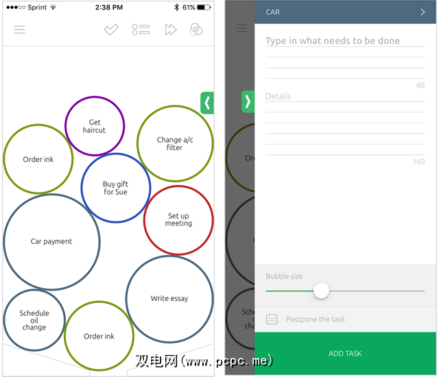 您可以选择一个内置类别或设置一个新类别,例如家庭,工作或个人。然后只需给您的任务起一个名字,如果需要就添加详细信息,然后选择气泡大小。气泡越大,任务就越重要。然后在主屏幕上,您将看到所有气泡,按类别进行颜色编码并且按优先级排列。