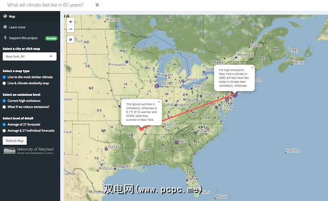 假设您搜索纽约市。该网站会将您带到阿肯色州的琼斯伯勒,因为这可能是2080年纽约市的感觉。