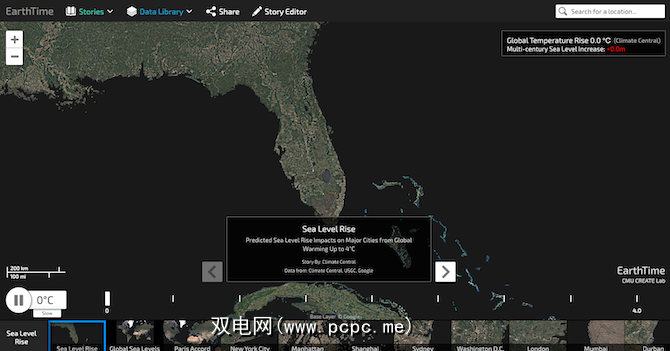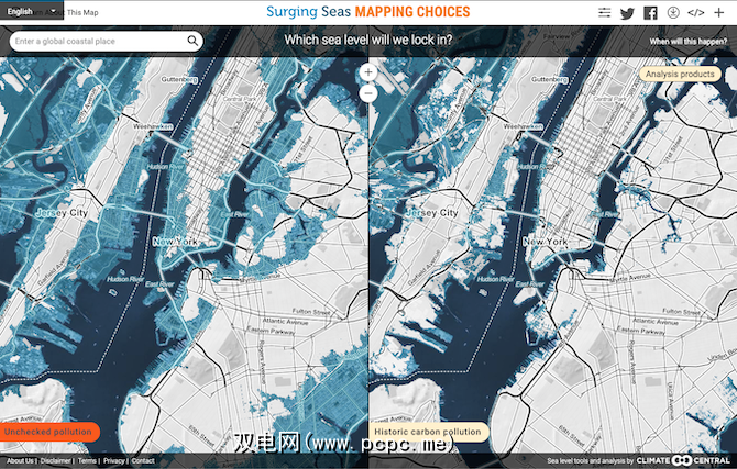 此处的其他可视化选择都是“历史性的"。碳污染,中等程度的碳削减和未经检查的污染。此外,您可以锁定特定的海平面上升并将其与碳排放水平相关联,以了解任何破坏的程度。