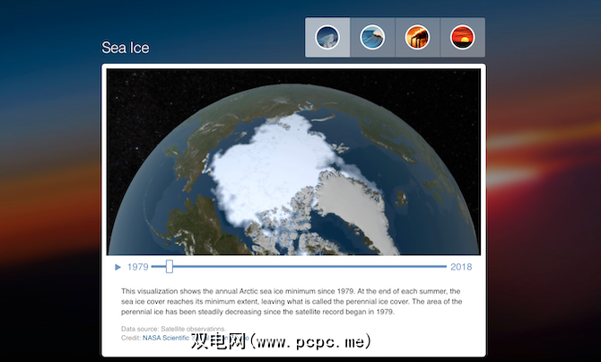 气候时间机器就是这样的一种应用程式。顾名思义,可视化使您能够了解当今和几年前海冰,二氧化碳,海平面和全球温度之间的差异。您可以手动调整滑块并在地图上查看更改。
