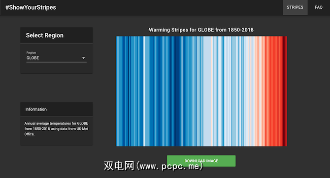 ShowYourStripes可以根据一个国家过去两个世纪的平均温度来生成条纹图案。它会根据当时的气候在特定的年份为蓝色和红色之间分配一种颜色。