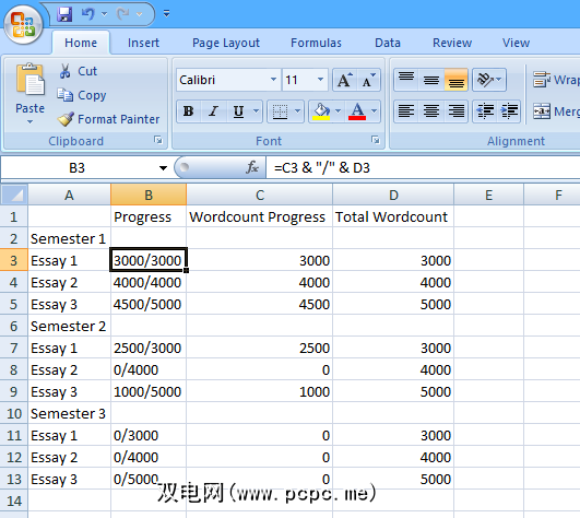 As you can see, I’ve used a simple function to make the ‘Progress’ column display the figure entered in ‘Wordcount Progress’ over the ‘Total Wordcount’. This allows the user to quickly amend their figures as they continue to make progress, which will then be reflected in the final dashboard. We also need to use the SUM function to work out totals for ‘Wordcount Progress’ and ‘Total Wordcount’ — to do so, enter the following formula in cell C15 without quotation marks “=SUM(C3,C4,C5,C7,C8,C9,C11,C12,C13)”, then drag out from the bottom right corner of the cell so it populates D15 with a similar formula for ‘Total Wordcount’.