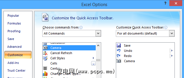为此,请访问Excel选项并选择“定制'。在此处,将“摄像机"命令从左列添加到右列。现在您可以轻松使用相机了,因此我们可以用来将仪表板放在一起。