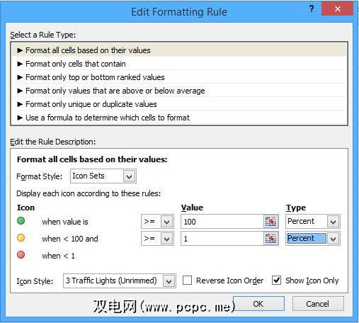 现在,我们只需要进行一些调整即可。按照格式化图标的规则。选中C列后,点击“条件格式",然后点击下拉菜单中的“管理规则"。那里只有一条规则,因此请选择它,然后单击“编辑规则"。在这里,将分配给绿色图标的值更改为100,并将琥珀色指示灯的下边界更改为1,这意味着任何完成的论文将显示绿色指示灯,任何进行中的论文将显示琥珀色指示灯,以及尚未启动,将显示红灯。最后,选中“仅显示图标"框,这样就不会显示百分比本身。